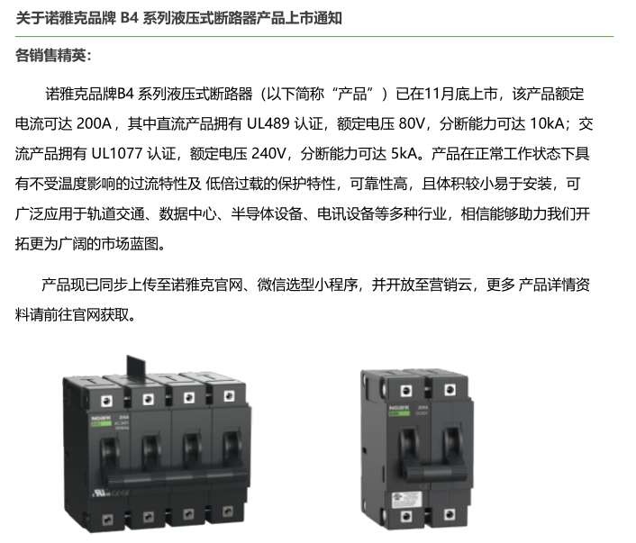 關(guān)于諾雅克品牌 B4 系列液壓式斷路器產(chǎn)品上市通知