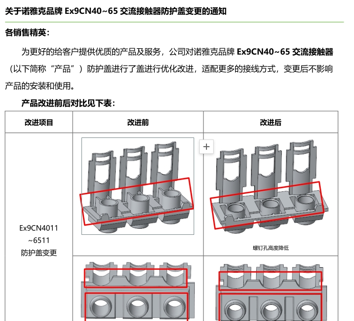 關(guān)于諾雅克品牌 Ex9CN40~65 交流接觸器防護(hù)蓋變更的通知