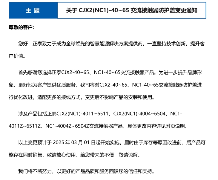 關于 CJX2(NC1)-40~65 交流接觸器防護蓋變更通知