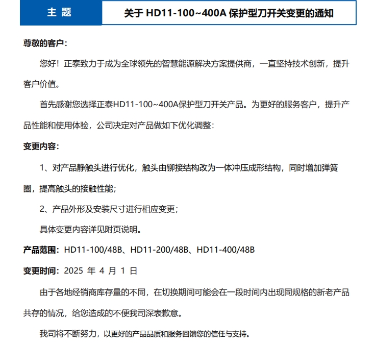 關(guān)于 HD11-100~400A 保護(hù)型刀開(kāi)關(guān)變更的通知