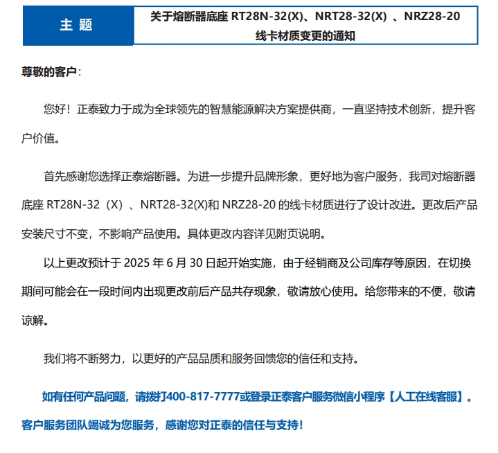 關(guān)于熔斷器底座 RT28N-32(X)、NRT28-32(X) 、NRZ28-20 線卡材質(zhì)變更的通知