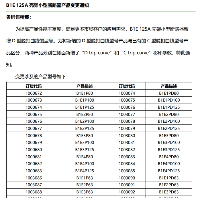 B1E 125A 殼架小型斷路器產(chǎn)品變更通知