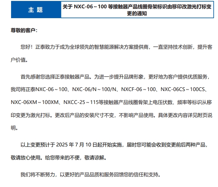 關于 NXC-06~100 等接觸器產(chǎn)品線圈骨架標識由移印改激光打標變 更的通知