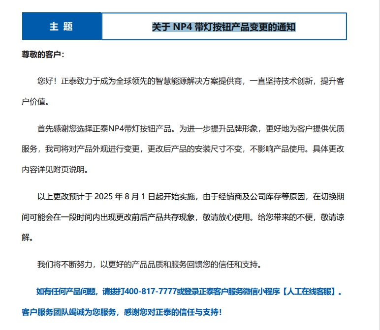 關(guān)于 NP4 帶燈按鈕產(chǎn)品變更的通知